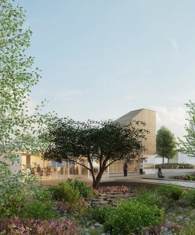 Le bâtiment conserve les éléments qui font sa force : poteaux, principe de brise-soleils et débords de toit (qui seront optimisés)… Pour le reste, l’isolation et les matériaux sont revus afin d’améliorer ses performances. L’effort porte notamment sur l’enveloppe thermique, la gestion de la surchauffe estivale et le recours aux matériaux biosourcés. Une chaufferie bois et des panneaux photovoltaïques complètent l’efficience environnementale du projet.