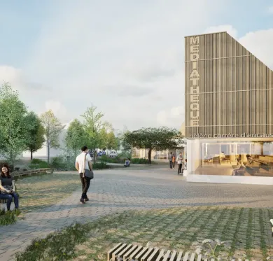 Façade visible mais ne donnant pas à voir l’usage du lieu, absence de lisibilité… La médiathèque de Carquefou s’est faite discrète, alors même que son bâtiment révèle une vraie personnalité, un potentiel à démontrer. Plusieurs interventions fortes vont lui permettre de renouer avec la ville, ses usagers et son époque.